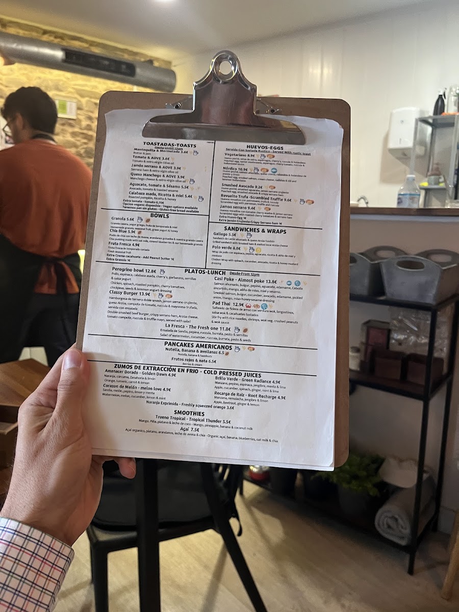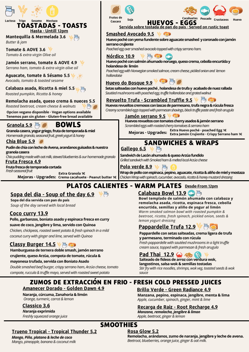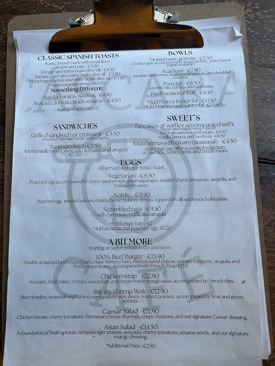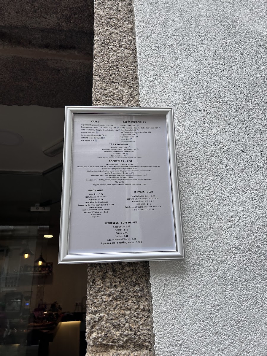 The menu at Cáscara Café & Brunch features a variety of offerings suitable for breakfast, brunch, lunch, and coffee breaks. It includes a selection of specialty coffees such as espresso-based drinks, including flat whites and iced lattes. Alongside the coffee options, the menu provides a range of light food choices, including gluten-free sandwiches and dishes with fresh, high-quality ingredients.